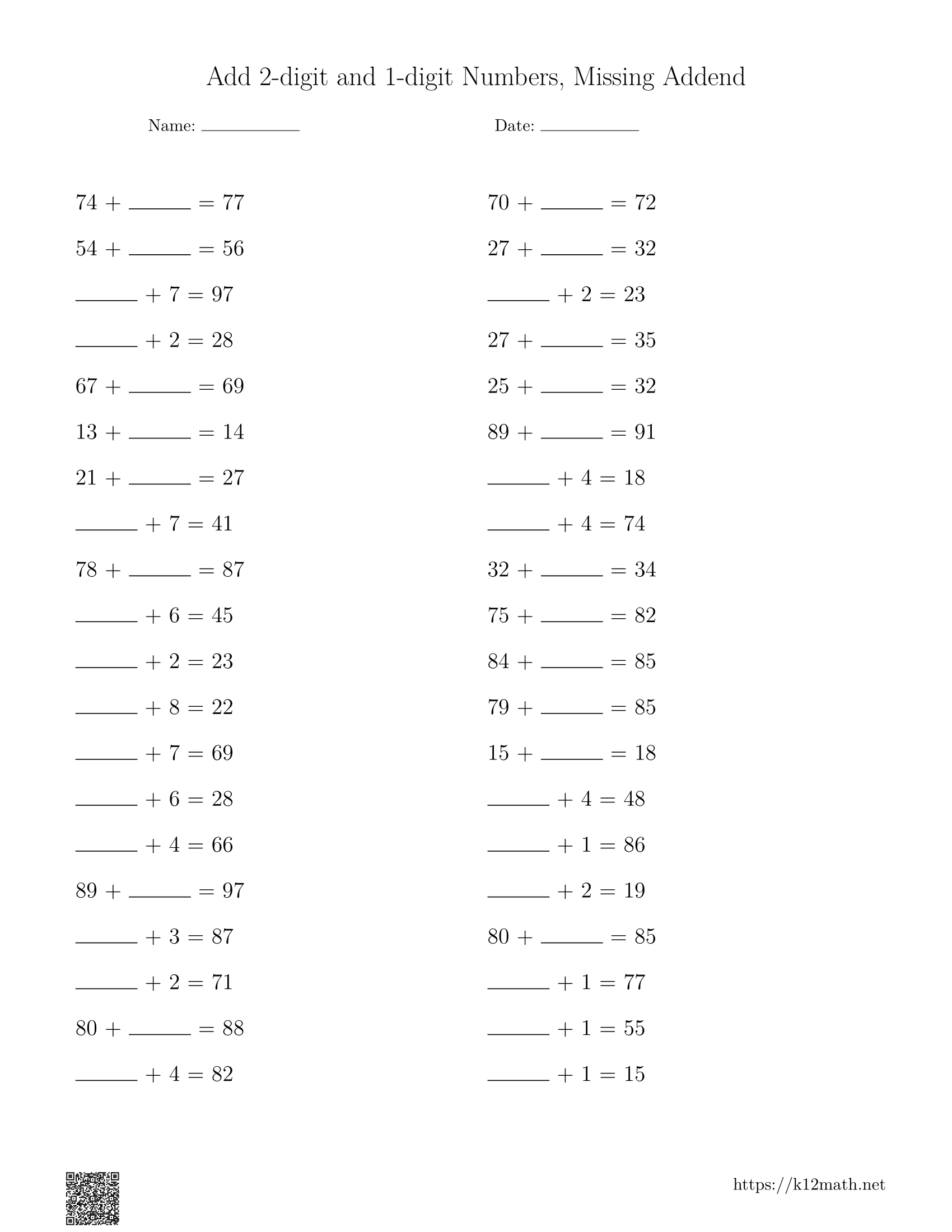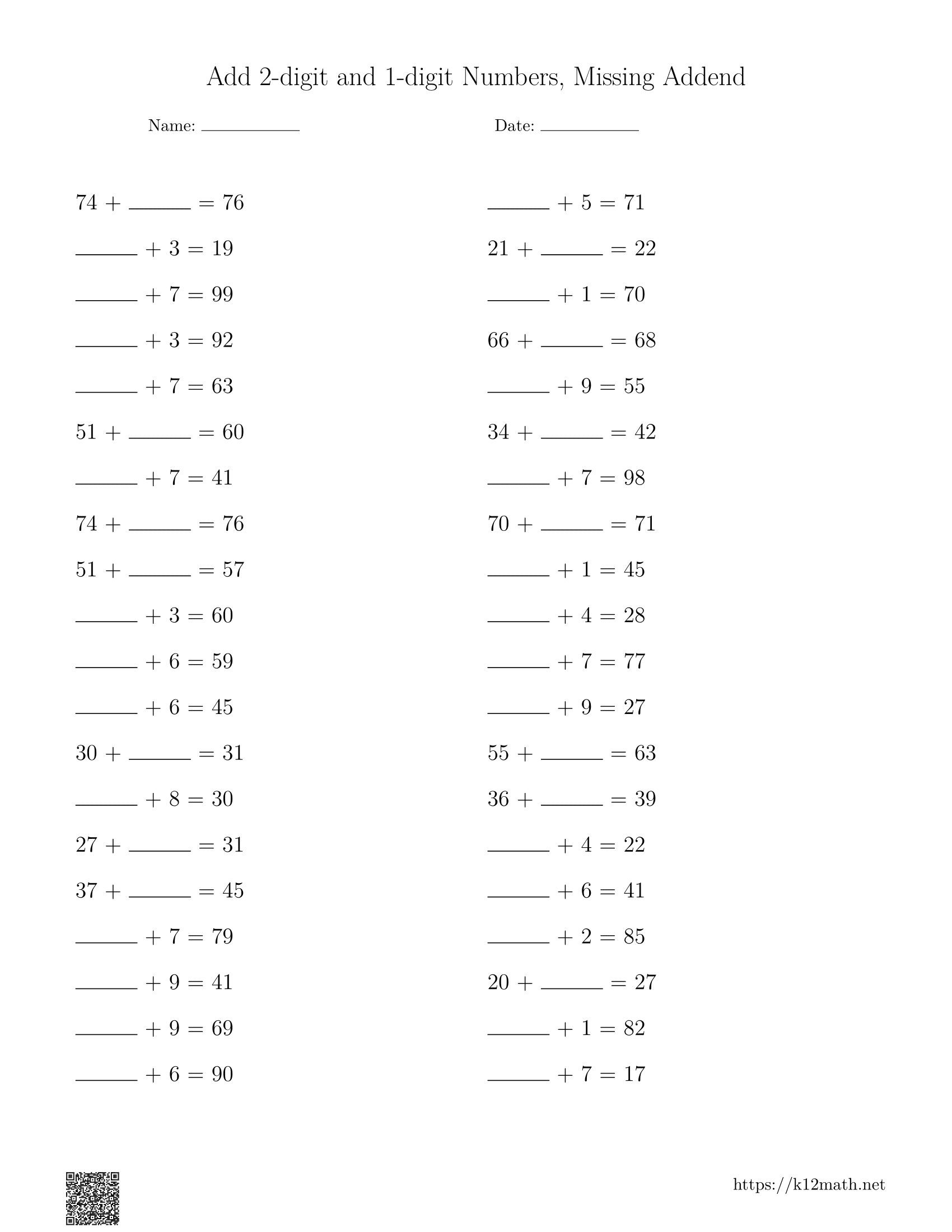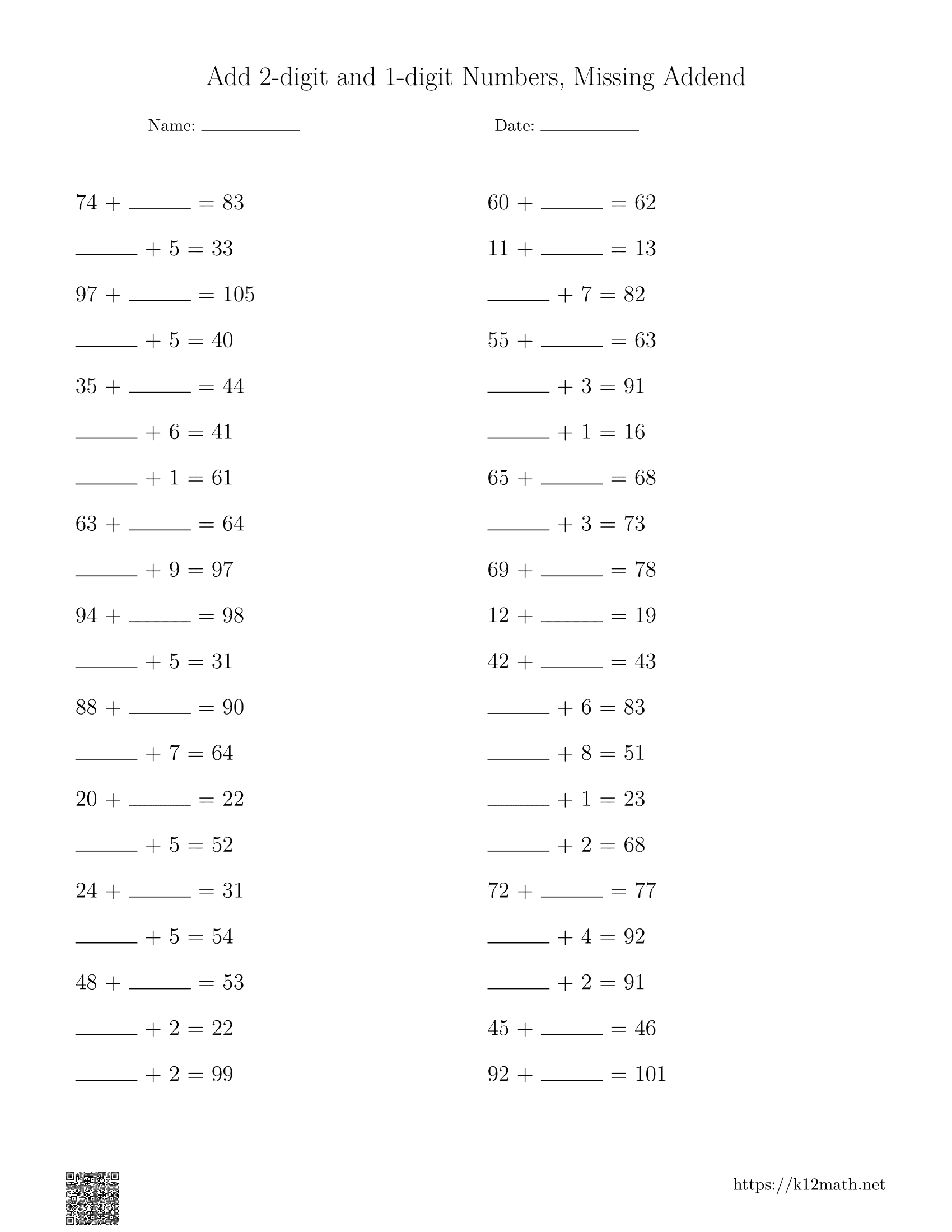 Add 1 & 2-digit Numbers, Missing Addend Worksheets